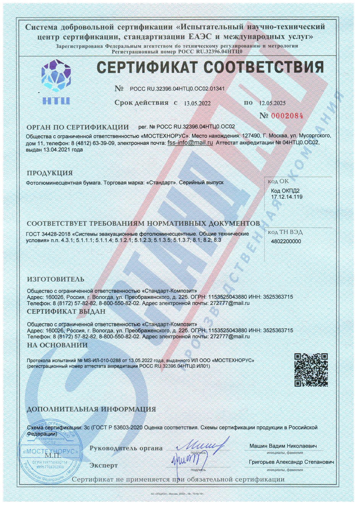 НАДЕЖНО Фотолюминесцентная бумага "Стандарт" соответствует требованиям ГОСТ 34428-2018 по всем показателям. Документация прилагается. Будьте уверены в качестве продукта, который вы выбираете.