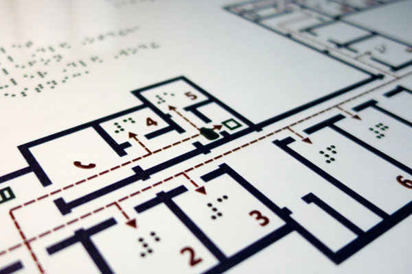 Мы разрабатываем и изготавливаем тактильные схемы движения с рельефными графическими элементами и поясняющим рельефным текстовым блоком, дублированным шрифтом Брайля.
