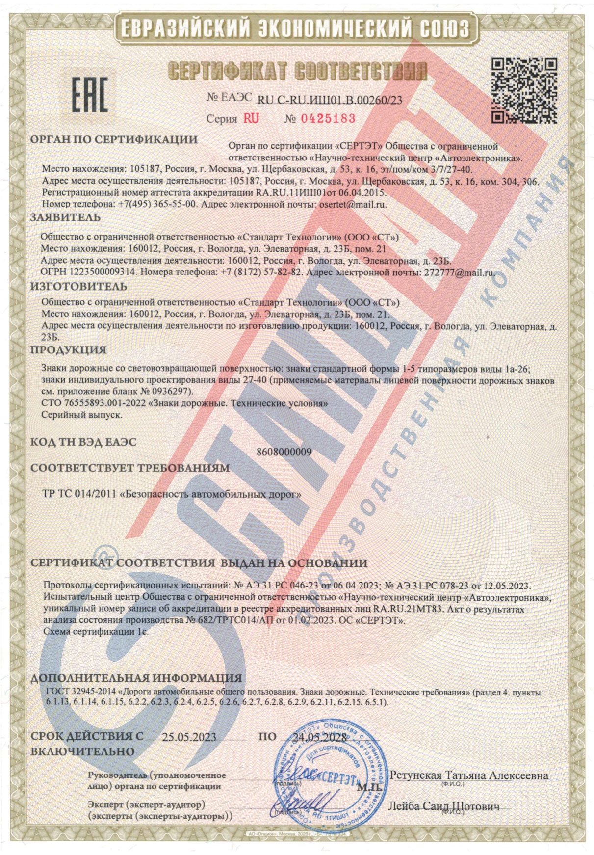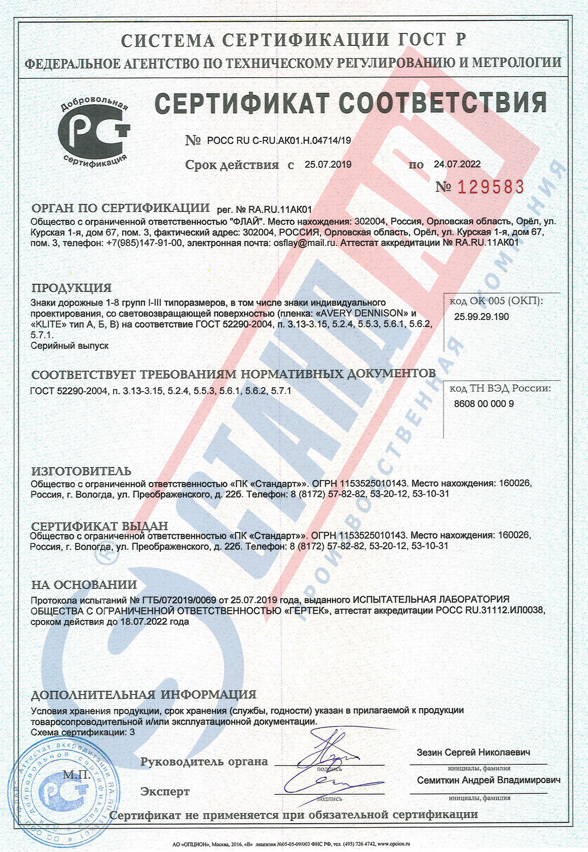 Производственная компания «Стандарт» изготавливает дорожные знаки и маски дорожных знаков в соответствии с ГОСТ Р 52290-2004, ГОСТ 32245-2014 и ТР ТС 014/2011 I, II, III, IV и V типоразмеров, а также знаки индивидуального проектирования любого размера (одинарные и составные). При изготовлении дорожных знаков и масок дорожных знаков используются пленки типа А, Б и В (3M, Avery, Klite). При изготовлении основ дорожных знаков в соответствии с ГОСТ 32245-2014 используется металл с толщиной цинкового покрытия не менее 20 мкр., что позволяет увеличить срок службы дорожных знаков.