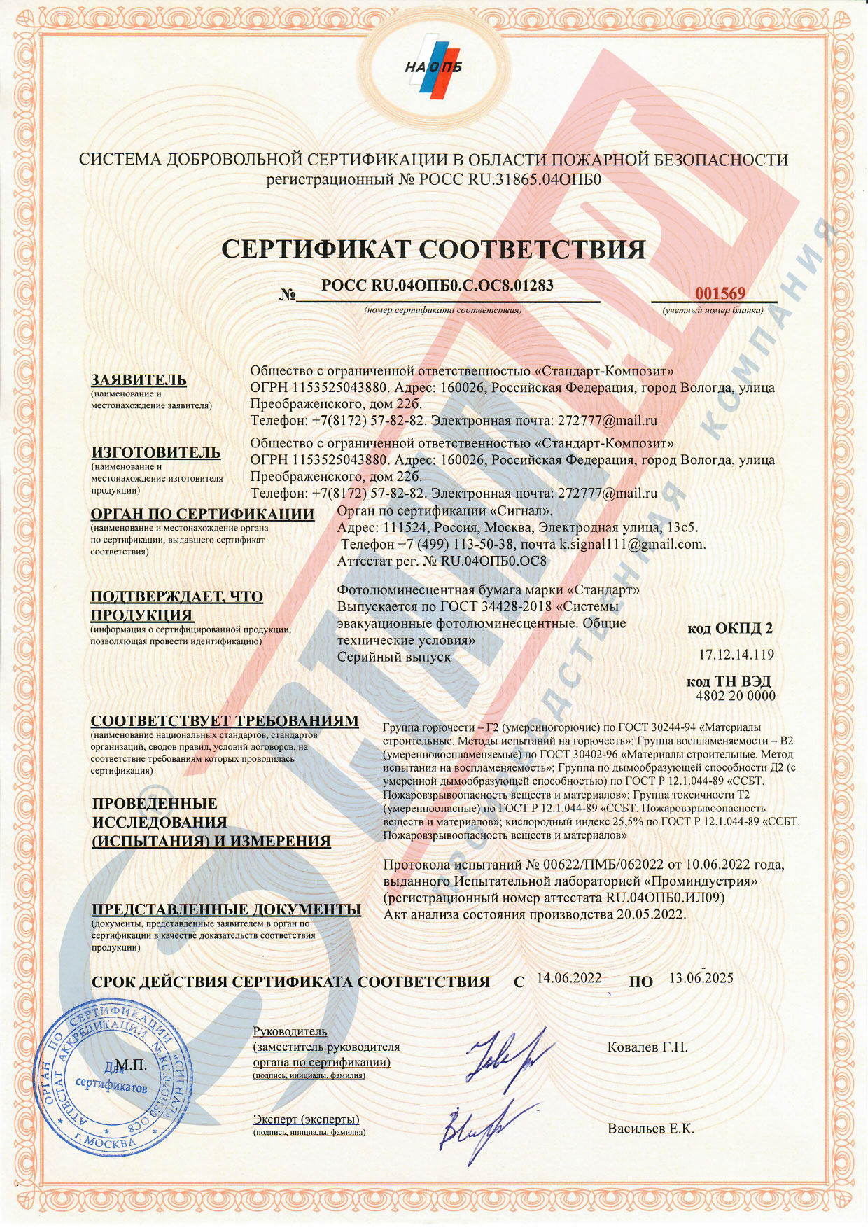 НАДЕЖНО Фотолюминесцентная бумага "Стандарт" соответствует требованиям ГОСТ 34428-2018 по всем показателям. Документация прилагается. Будьте уверены в качестве продукта, который вы выбираете.