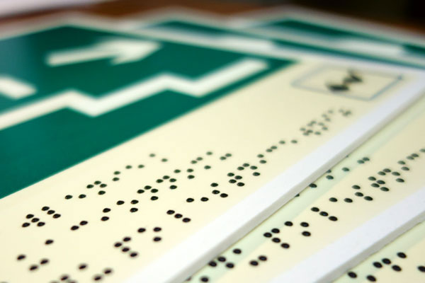 Мы дополняем знаки безопасности полем с рельефной пиктограммой и поясняющим рельефным текстом, выполненным шрифтом Брайля.
