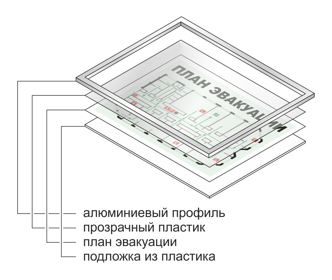 Для закрепления плана эвакуации на стене и для дополнительной защиты самого плана мы предлагаем алюминиевые рамки для планов эвакуации. Размер рамок подогнан для соответствия фотолюминесцентной бумаге "Стандарт". Помимо самой рамки в комплекте идет пластиковая подложка под план эвакуации и прозрачный ПЭТ-пластик для защиты плана от внешний воздействий.