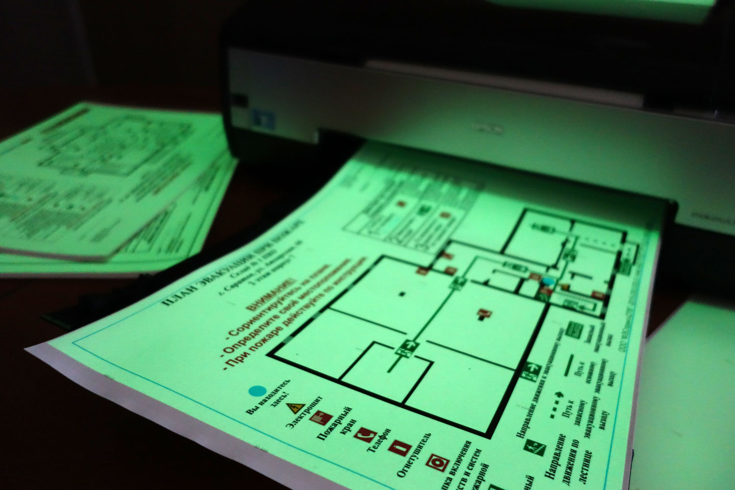 Фотолюминесцентная бумага «Стандарт S200» предназначена для печати планов эвакуации на струйных принтерах в соответствии с ГОСТ 34428-2018.